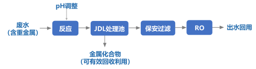 JDL工藝集固液分離、固體懸浮物濃縮、廢水處理回用、重金屬資源回收于一體,實現(xiàn)了“廢水處理回用+重金屬資源回收”的重金屬廢水處理模式;出水水質(zhì)達到相關(guān)行業(yè)重金屬廢水排放標(biāo)準,回收重金屬可作為相關(guān)產(chǎn)品直接利用,顯著減少了剩余危廢物,實現(xiàn)了廢水中有價金屬的資源化,一定程度上緩解了重金屬危廢處理難題;處理過程中不加入聚丙烯酰胺(PAM)、鐵鹽、鋁鹽等絮凝劑,使膜組件不易堵塞。